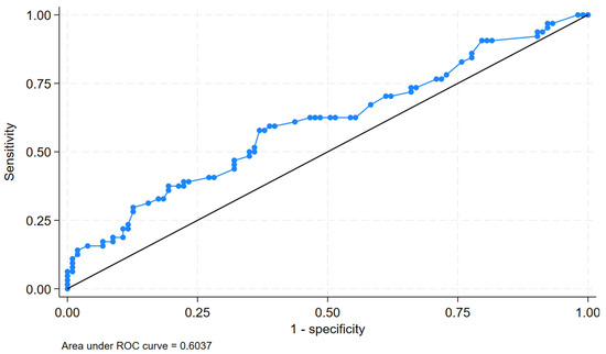 Based on Liu’s method, the optimal cutoff of the E/A ratio to predict a worsening status was 2.09, which provided a sensitivity of 58% and specificity of 63%. The area under the curve at this threshold was 0.60, indicating modest discriminative ability.