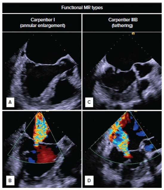 Carpentier classification: (A) Type1: Normal Leaflet Motion. (B,C) Excessive leaflet motion, such as prolapse or flail leaflets, often due to papillary muscle rupture, chordae rupture, or redundant chordae. Seen more often in atrial fibrillation and non-ischemic cardiomyopathy. (D) Type IIIb: Restricted motion primarily during systole, commonly associated with left ventricular dilation, papillary muscle dysfunction, or tethering of the leaflets. Seen in Ischemic cardiomyopathy.