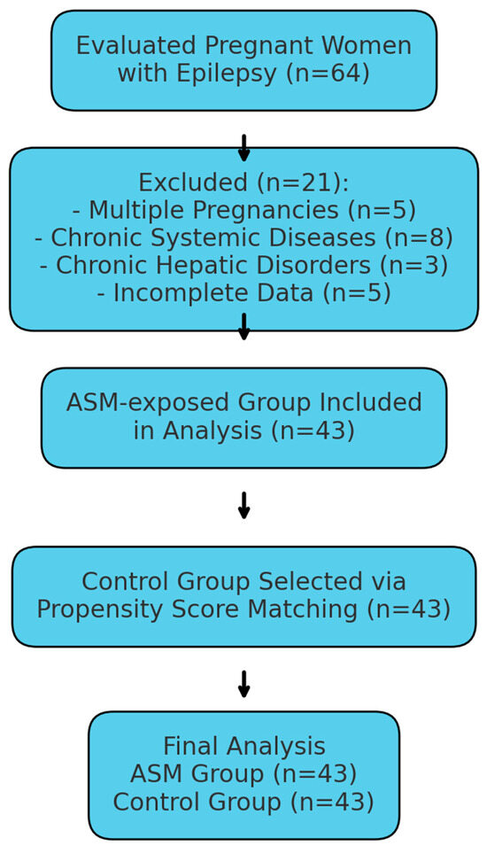 Medical records of pregnant women with epilepsy who attended our obstetrics and gynecology departments between January 2020 and September 2024 were retrospectively reviewed. Pregnant women aged between 18 and 44 years using ASMs throughout pregnancy and having second-trimester maternal serum screening test results available were included. The exclusion criteria for the epilepsy group were multiple pregnancies, chronic systemic diseases (such as diabetes mellitus, hypertension, or autoimmune disorders), known chronic hepatic disorders (e.g., chronic hepatitis, cirrhosis, and primary biliary cholangitis), and pregnancies with incomplete medical records or unavailable serum screening results. Isolated elevations in the levels of liver enzymes (alanine aminotransferase (ALT) or aspartate aminotransferase (AST)) were not considered exclusion criteria in the epilepsy group, as these elevations could potentially relate to ASM use. Initially, the medical records of 64 pregnant women with epilepsy were evaluated. Among these, 5 patients were excluded due to multiple pregnancies, 8 patients due to chronic systemic diseases (4 with diabetes mellitus, 3 with hypertension, and 1 with autoimmune disorder), 3 patients due to known chronic hepatic disorders, and 5 patients due to incomplete medical records or unavailable serum screening test results. After applying these inclusion and exclusion criteria, a total of 43 patients remained eligible and were included in the analysis. For patients using ASMs, the medication consistently used during at least the three months prior to the second-trimester maternal serum screening test was taken as the basis for the analysis. Figure 1 illustrates the patient selection process, detailing the reasons for exclusion and clearly showing the final number of participants included in the ASM-exposed and control groups.