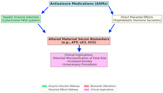 The elevated maternal serum AFP and uE3 levels observed in our study may be explained by several pharmacological and physiological mechanisms associated with ASM use. Primarily, certain ASMs, especially carbamazepine, are known to induce hepatic microsomal enzymes, particularly the cytochrome P450 enzyme system, which plays a critical role in hormone metabolism and clearance [11,13]. Increased hepatic enzyme activity could accelerate hormone clearance and trigger compensatory increases in AFP and uE3 synthesis. Although lamotrigine and levetiracetam are generally recognized as weaker enzyme inducers than carbamazepine, these ASMs might still influence hormonal pathways through alternative mechanisms, including the modulation of placental transport functions, indirect effects on maternal liver metabolism, and increased renal clearance during pregnancy due to enhanced renal blood flow and glomerular filtration rate [16,17]. The absence of significant changes in hCG levels in our study aligns with previous findings [6,7]. This could be due to hCG secretion being less susceptible to hepatic enzyme induction and primarily regulated by placental trophoblastic activity, differing mechanistically from steroid hormone synthesis pathways. Similar interpretations were provided by Besimoglu et al. and Oksuzoglu et al., who suggested that different hormonal markers exhibit variable sensitivity to the effects of ASMs, reflecting diverse metabolic and physiological pathways [6,7]. We believe that our findings reflect these multifaceted pharmacological and physiological mechanisms. These potential mechanisms and their clinical implications are clearly illustrated in Figure 2.