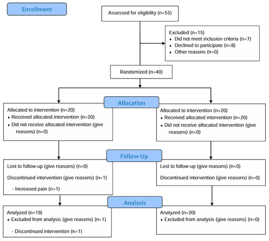 No previous study has compared the effectiveness of PPT and PT in patients with chronic knee pain to serve as the basis for sample size calculation. As this was a pilot study aimed at assessing the feasibility of a future main study, the minimum number considered acceptable for a pilot study—15 participants per group—was used [23,24]. Assuming a 25% dropout rate and considering the need for subgroup analysis, we recruited 20 patients for each group (total of 40 patients).