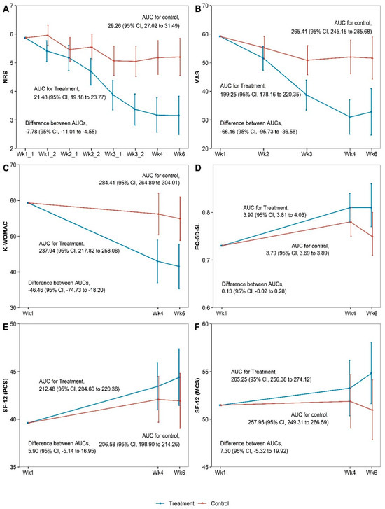 Areas under the curve for the outcomes at week 6 for (A) Numeric rating scale, (B) Visual analogue scale, (C) Korean Western Ontario and McMaster, (D) Five-level EuroQol 5 dimension, (E) Physical component summery, (F) Mental component summary. AUC, area under the curve; CI, confidence interval; EQ-5D-5L, five-level EuroQol 5 dimensions; K-WOMAC, Korean Western Ontario and McMaster; MCS, mental component summary; NRS, numeric rating scale; PCS, physical component summary; SF-12, Short Form-12 Health Survey version 2; VAS, visual analog scale.