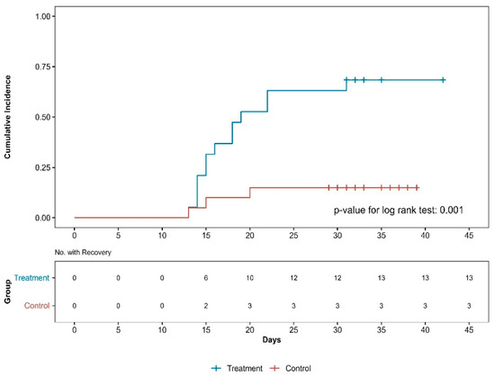 Survival analysis confirmed that the PPT group had a shorter recovery time than the control group (p < 0.001, log-rank test; Figure 3). The hazard ratio of the PT group to the PPT group using the Cox regression model was 0.16 (95% CI: 0.04–0.65, p < 0.015, p < 0.001 by log-rank test). The number of patients who recovered by the last follow-up was 13 in the PPT group and 3 in the PT group.