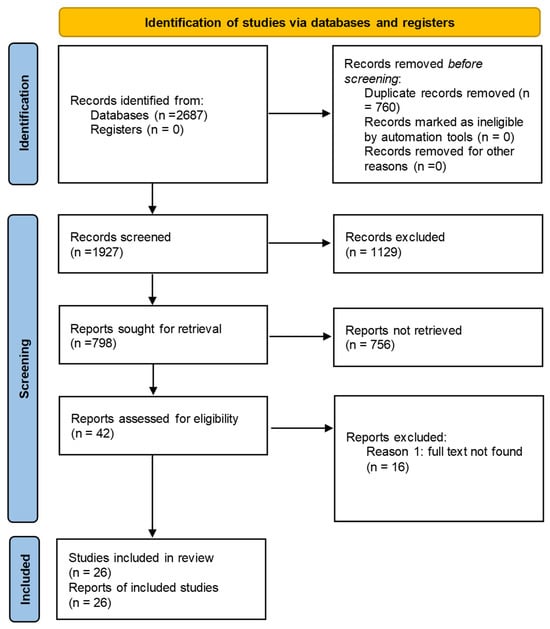 The study selection process for this meta-analysis is visually depicted in the flow diagram (Figure 1). The initial database search yielded 2687 records. After removing 760 duplicate entries, 1927 unique records remained. The subsequent screening of titles and abstracts resulted in the exclusion of 1129 records deemed irrelevant to the study, resulting in 798 potentially eligible records. Following this, 756 records were excluded for not meeting the eligibility criteria. Of the remaining 42 records, the full texts were reviewed, and 16 were excluded due to the full texts not being retrieved. A total of 26 studies met all the eligibility criteria and were included in the review and meta-analysis. The article selection adhered to the Preferred Reporting Items for Systematic Reviews and Meta-Analyses (PRISMA) criteria, (Checklists S1 and S2) [].