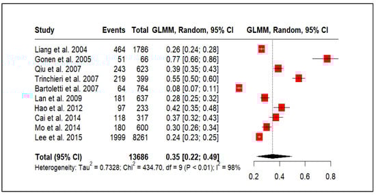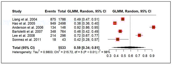 - Migliavaca, C.B.; Stein, C.; Colpani, V.; Barker, T.H.; Ziegelmann, P.K.; Munn, Z.; Falavigna, M.; Prevalence Estimates Reviews—Systematic Review Methodology Group. Meta-analysis of prevalence: I2 statistic and how to deal with heterogeneity. Res. Synth. Methods 2022, 13, 363–367. [Google Scholar] [CrossRef]