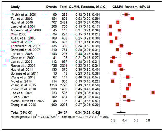 The following supporting information can be downloaded at: https://www.mdpi.com/article/10.3390/medicina61061110/s1, Table S1: Final Search Strategy for Each Database; Table S2. Finding related to Risk bias of observational studies included in meta-analysis (n = 26). Checklist S1: PRISMA 2020 abstract checklist; Checklist S2: PRISMA 2020 checklist.