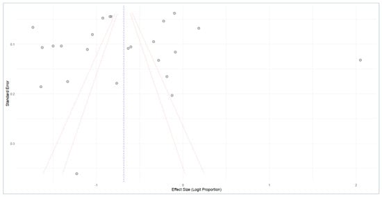 The publication bias in the sexual dysfunction meta-analysis is assessed in Figure 5 (funnel plot). The plot visualizes the relationship between the standard error and the logit-transformed proportion of sexual dysfunction for each study. While a symmetrical distribution is expected in the absence of bias, the observed plot exhibits some asymmetry, particularly with a scarcity of smaller studies in the bottom-left region, potentially indicating a lack of studies reporting lower prevalence. This visual suggestion of publication bias is further highlighted by the placement of several studies outside the inner (95% CI) and outer (99% CI) pseudo-confidence intervals (red dotted lines). Although the funnel plot visually suggested a potential publication bias, Egger’s regression test for funnel plot asymmetry did not yield a statistically significant result (t = −0.39, df = 22, p-value = 0.7034). This suggests that, statistically, there is no strong evidence of small-study effects or publication bias. Although the visual inspection hinted at a potential issue, the Egger’s test result tempers this concern, indicating that the apparent asymmetry might be due to chance or other factors unrelated to publication bias. Therefore, while the funnel plot warrants consideration, the lack of statistical support from Egger’s test suggests that publication bias is unlikely to be a substantial threat to the validity of the meta-analysis conclusions.