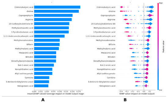 Figure 1 shows the importance ranking of metabolomics based on the SHAP explainability method of the LightGBM model and the effects of metabolomics on the model output. Figure 1A, the ranking of metabolomics according to average SHAP values, shows that 2-Aminobutyric acid is the most effective metabolite in the model, followed by choline, coproporphyrin, arginine, and 20-Carboxyleuthoriene B4, respectively. Figure 1B visualizes the SHAP values of individual data points and the effects of low (blue) and high (pink) values of metabolites on the model output. In particular, it was determined that low values of 2-Aminobutyric acid, choline, arginine, and 20-Carboxyleuthoriene B4 metabolites, in addition to high levels of coproporphyrin metabolites, increased the risk of breast cancer. These results suggest that biochemical compounds play an important role in the decision-making process of the LightGBM model and that these compounds are determinant in predicting clinical outcomes. The metabolites identified in this study, including 2-Aminobutyric acid, choline, and coproporphyrin, are established to be critical regulatory molecules involved in amino acid and lipid metabolism, which are often dysregulated in breast cancer. They may signal underlying tumor biology and may help uncover or predict disease progression (Figure 1). Detailed group-wise descriptive statistics (mean ± SD) and significance levels (p < 0.001) for the 20 key metabolites identified through SHAP analysis are reported in Supplementary Table S1.
