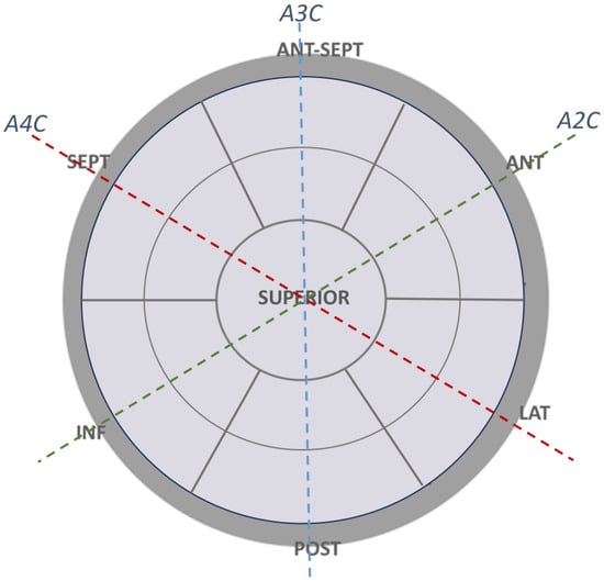 Schematic presentation of the left atrium. Seven walls were defined: septal, antero-septal, anterior, lateral, posterior, inferior, and superior. Outer ring—basal segments, middle ring—mid-segments, inner circle—superior segments. Red, green and blue punctuated lines correspond to 4-chamber, 2-chamber, and 3-chamber projection of the left atrium, respectively. A4C—apical 4-chamber view, A2C—apical 2-chamber view, A3C—apical 3-chamber view.