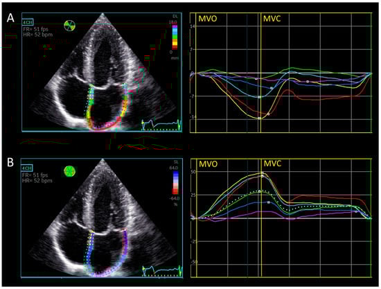 Longitudinal displacement and strain of the left atrium. (A) Apical 4-chamber view, longitudinal displacement curves from six segments are shown. MVO—mitral valve opening. MVC—mitral valve closure. (B) Apical 4-chamber view. Regional and global longitudinal strain from left atrium is shown. MVO—mitral valve opening. MVC—mitral valve closure.