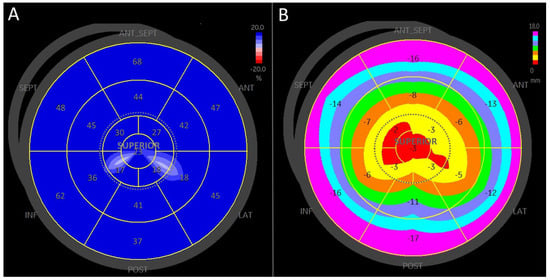 A bullseye plot of left atrial longitudinal strain and displacement in a healthy 23-year-old male demonstrates a gradient from basal to superior segments. ANT-SEPT—antero-septal wall, SEPT—septal wall, INF—inferior wall, POST—posterior wall, LAT—lateral wall, ANT—anterior wall, SUPERIOR—superior wall. (A) Left atrial regional longitudinal reservoir strain map. The map shows higher strain values in the basal segments compared to the mid-atrium, with the mid-atrium exhibiting higher strain than the superior wall. (B) Left atrial regional longitudinal reservoir displacement map. Longitudinal displacement is greater in the basal segments compared to the mid-atrium, with displacement in the mid-atrium being higher than in the superior segments.