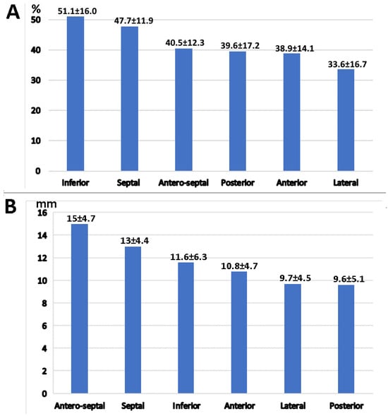 The inferior wall exhibited the highest strain at 51.1 ± 16.0%, followed by the septal wall strain at 47.7 ± 11.9% (Figure 4). The greatest strain values were observed in the inferior and antero-septal segments (Figure 4). Similarly, the highest longitudinal displacement was noted in the antero-septal, septal, and inferior segments (Figure 4).