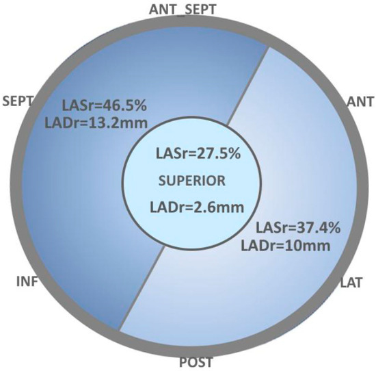 Both the reservoir strain and longitudinal displacement across the septal, antero-septal, and inferior segments were significantly higher compared to the anterior, lateral, and posterior segments (46.5 ± 14.2% vs. 37.4 ± 16.3%; p < 10−5, and −13.2 ± 5.4 mm vs. −10 ± 4.8 mm; p < 10−5), as shown in Figure 5.