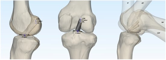 Computed tomography (CT) images of the knee from nine subjects were included in this study. The nine knee models consisted of six males and three females. Three-dimensional CT scans were acquired using a 16-channel CT scanner (GE Healthcare, Chicago, IL, USA) with 0.625 mm slice thickness at four distinct knee flexion angles (0°, 45°, 90°, and 120°) in healthy volunteers. Subjects were selected based on the following inclusion criteria: (1) absence of femoral or tibial fractures; (2) no osseous deformities; (3) no ligamentous injuries; (4) no history of surgical intervention; and (5) absence of osteoarthritis exceeding Kellgren-Lawrence grade I []. Digital Imaging and Communications in Medicine (DICOM) data were extracted from the picture archiving and communication system (Centricity PACS, GE Medical System Information Technologies, Milwaukee, WI, USA). These data were subsequently imported into Mimics software (version 21.0; Materialise, Leuven, Belgium) for three-dimensional (3D) reconstruction of the femoral and tibial models.