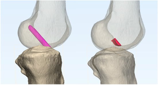 For each configuration, the impingement volume was quantified by measuring the overlap between the intercondylar notch of the femoral condyle and the virtual graft. This measurement was performed using Boolean operators in the Mimics 3D simulation program, which has been validated to provide measurement accuracy within 1 mm [] (Figure 2).