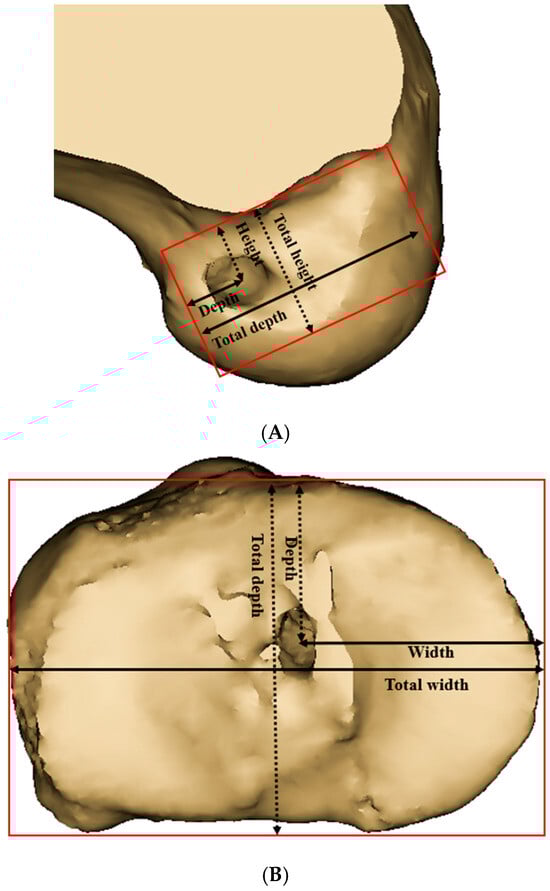 According to previous studies using 3D CT models, the femoral center of the AM bundle footprint was identified at a point located 25% of the total height, measured from the superior to inferior border of the medial wall of the lateral femoral condyle, and 33% of the total depth, measured from the anterior to posterior border [,]. The femoral center of the PL bundle footprint was identified at a point located 45.1% of the total height and 50% of the total depth, measured in the same manner.