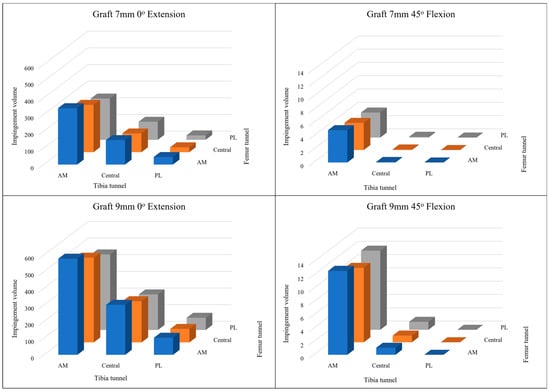 The femoral AM—tibial AM configuration demonstrated the highest impingement volume (577.8 ± 171.3 mm3 for 9 mm grafts), while the femoral PL—tibial PL configuration showed the lowest (73.5 ± 85.6 mm3). This nearly eight-fold difference highlights the critical importance of tunnel positioning in controlling graft impingement. These findings align with previous studies indicating that anterior placement of both femoral and tibial tunnels increases the risk of graft impingement [,,,].