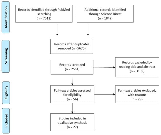 An initial search yielded 9354 articles. After removing duplicates, 2561 articles remained for screening. Based on the previously defined selection criteria, 154 articles were identified as suitable for full-text review. Following this review and a manual examination of reference lists, a total of 27 articles met the final inclusion criteria (Figure 1).