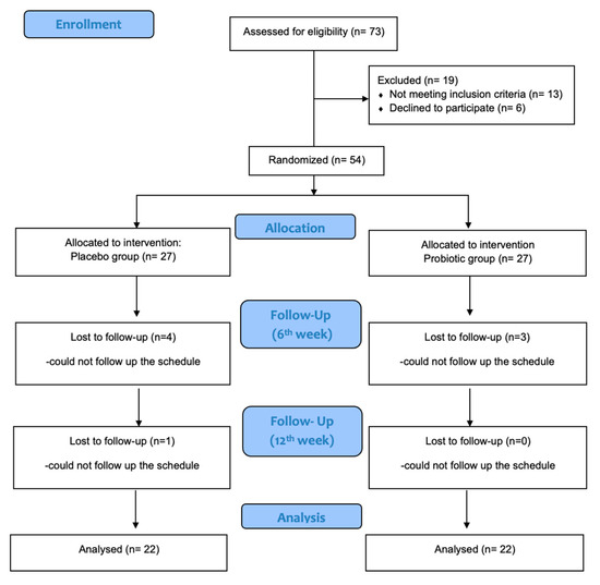 A total of 73 potential participants were initially screened based on the inclusion and exclusion criteria; 13 participants did not meet the conditions for participation in this study, and 6 people decided not to participate after the evaluation process, as they could not meet the schedule that was set. Finally, 54 individuals (n = 15 men and n = 39 women) were eligible and provided their informed consent. The participants were randomly assigned to either the placebo or probiotic groups, and this distribution was unknown to them. This study was completed with 46 volunteers (30% men; probiotic group, n = 24; placebo group, n = 22), as eight people dropped out during the 12-week intervention. The flowchart of this study is presented in Figure 1.