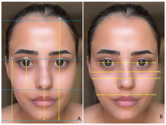 (A,B) Measured variables related to the face. F1—facial height (distance between nasion and menton); F2—upper face width (distance between external corner of the right eye and external corner of the left eye); F3—lower face width (bigonial width); F4—upper face height (distance between nasion and subnasale); F5—lower face height (distance between nasion and menton); F6—inter-tragus width; F7—facial width (bizygomatic width); and F8—total facial height.