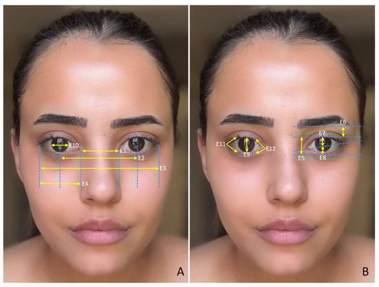 (A,B) Measured variables related to the eye. E1—internal intercantal distance; E2—interpupillary distance; E3—external intercantal distance; E4—palpebral fissure length (distance between medial and lateral canthus (eye width)); E5—palpebral fissure height (distance between upper and lower eyelids); E6—distance between the margin of the upper eyelid and the eyebrow; E7—distance between the midpoint of the eye and the edge of the upper eyelid; E8—distance between the midpoint of the eye and the edge of the lower eyelid; E9—vertical diameter of the iris (apparent); E10—horizontal diameter of the iris (apparent); E11—lateral canthus angle; and E12—medial canthus angle.