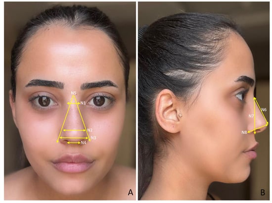 (A,B) Measured variables related to the nose. N1—nasal root width; N2—nasal dorsum width; N3—alar width; N4—subalar width; N5—nasal root angle; N6—nasal length; N7—nasal height; and N8—nasal tip projection.