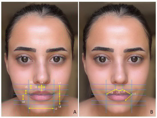 (A,B) Measured variables related to the lip. L1—philtrum width; L2—mouth width; L3—distance between crista philtrum and subalare; L4—philtrum height; L5—upper vermilion height; L6—lower vermilion height; L7—upper lip height; L8—lower lip height; L9—distance from chelion to crista philtrum; L10—distance between crista philtrum and stomion; L11—chelion angle; and L12—philtrum base angle.