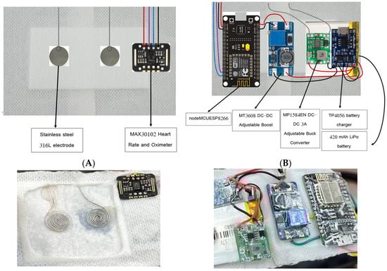 Photographic illustration of the fabricated smart bandage system. (A) Front view showing the placement of spiral stainless steel (316L) electrodes and the MAX30102 sensor for heart rate and oxygen saturation monitoring. (B) Rear view displaying key electronic components including a NodeMCU ESP8266, MT3608 DC–DC boost converter, MP1584EN buck converter, TP4056 battery charger, and 420 mAh LiPo battery.