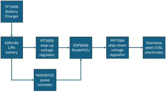 A 420 mAh Lithium Polymer (LiPo) battery provided the necessary power to sustain these functions efficiently. To regulate the voltage distribution, the step-down regulator ensures a stable 2 V output essential for generating the electric field, while a step-up regulator increases the voltage to 5.5 V to adequately power the NodeMCU ESP8266 (Wi-Fi microcontroller unit) (Espressif Systems, Shanghai, China). This microcontroller plays a pivotal role in controlling system operations, processing data from sensors, and wirelessly transmitting information to a cloud-based monitoring platform. For real-time health monitoring, the MAX30102 sensor (Analog Devices, Wilmington, MA, USA) continuously tracks vital parameters, including heart rate (BPM), oxygen saturation (SpO2), and temperature (°C).