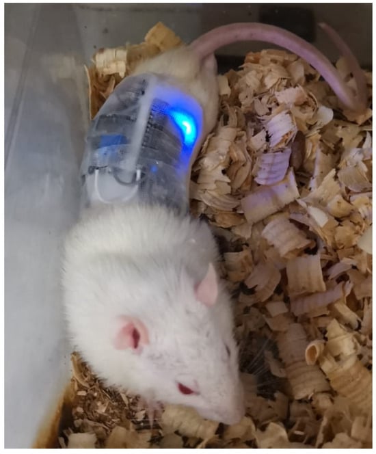 Immediately following wound induction, treatment protocols were initiated. In the experimental group, a smart bandage system was applied directly over the gauze dressing to ensure optimal electrode contact with the wound site. This system delivered a controlled electric field (EF) stimulation by applying a 2 V potential across stainless steel electrodes, generating a localized EF of 200 mV/mm. The EF device operated continuously for 5 h per day over a 14-day period, providing a consistent therapeutic dose. Simultaneously, the smart bandage continuously monitored and recorded key physiological parameters—heart rate (BPM), oxygen saturation (SpO2), and body temperature (°C)—which were transmitted to a cloud-based platform for real-time tracking and analysis. The wireless design allowed for unrestricted animal movement throughout the treatment period, as demonstrated in Figure 3.