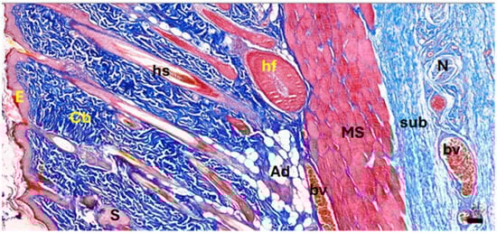 Photomicrograph of normal back skin of one of the experimental rats showing the cutaneous layers and their contents. Epidermis (E), collagenous bundles (Cb), hair shaft (hs), hair follicle (hf), sebaceous gland (S), adipose tissue (Ad), blood vessels (bv), nerves (N), cutaneous muscle (MS), and subcutaneous tissue (sub). Magnification: ×40. Stain: MS. Bar: 50 micrometers (µm).