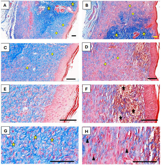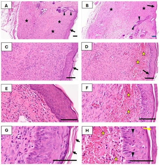 Histological examination revealed an increase in epidermal thickness in both groups, from an average of 31 µm in intact skin to 54 µm post-healing. A notable difference was observed in the stratum corneum; in the EF-treated group, this layer consisted of viable cells, whereas in the control group, it was composed of dead, cornified cells. Furthermore, the stratum spinosum in the EF group contained a significantly higher number of mitotically active cells, highlighting increased cellular proliferation. Histological sections stained with H&E (Figure 5) illustrate these distinctions. The healed skin in both groups showed intact epithelium with black arrows indicating specific points of interest. In the EF group, subepithelial blood vessels were more apparent (stars in panels D, F, and H), and the stratum corneum and spinosum displayed living cells and active cell division (yellow arrows and arrowheads in panel H), contrasting with the dead, cornified cells in the control group (arrows in panel G).
