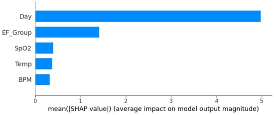 To interpret feature contributions, SHAP (SHapley Additive exPlanations) analysis was conducted on the top-performing model, allowing for quantification of the influence of each feature on the model’s output []. This provided insights into the physiological and temporal parameters most critical for distinguishing between healed and non-healed wounds.