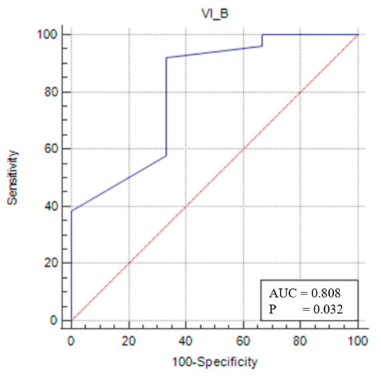 In the male sarcopenic patients, VIT/TL was found to be statistically significant, and a cut-off value was determined (p < 0.05). A VIT/TL value of ≤0.041 (p = 0.0319) had 92.31% sensitivity and 66.67% specificity in demonstrating that a patient was sarcopenic (Figure 3).