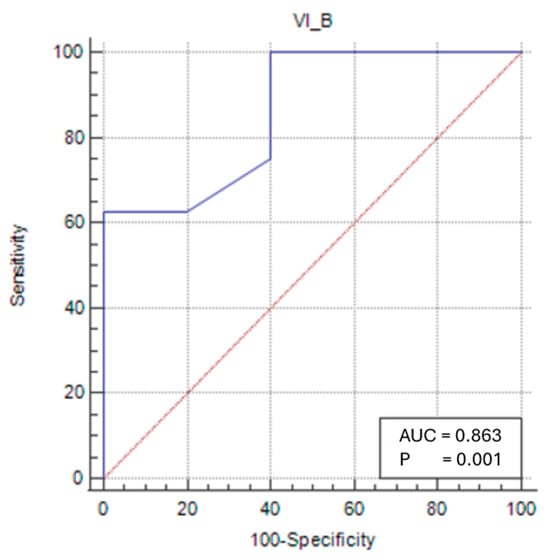 In the female sarcopenic patients, VIT/TL was found to be statistically significant, and a cut-off value was determined (p < 0.05). At a cut-off value of ≤0.028 (p = 0.0009), VIT/TL had a sensitivity of 62.5% and a specificity of 100% in predicting sarcopenia status (Figure 4).