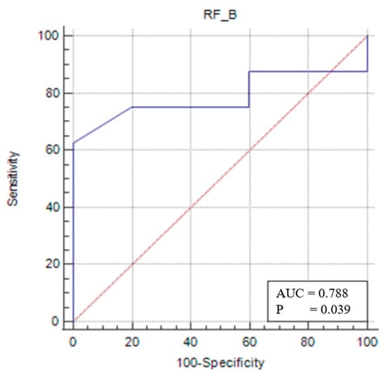 For the female sarcopenic patients, an RFT/TL of ≤0.025 (p = 0.0391) predicted sarcopenia with 62.5% sensitivity and 100% specificity (Figure 5).