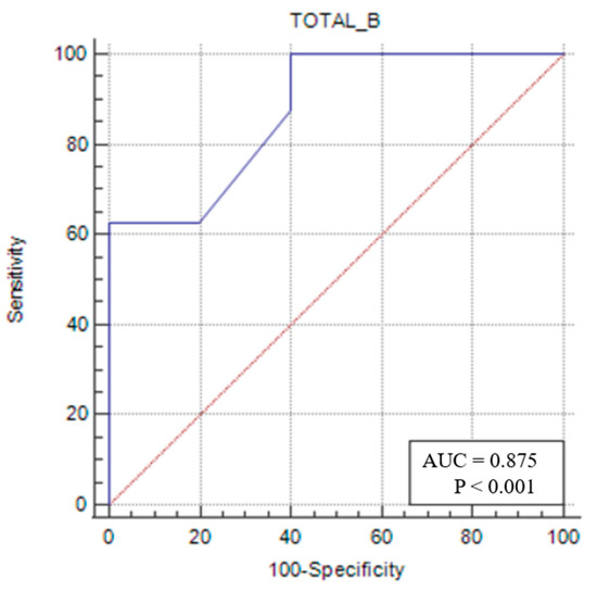 Sensitivity–specificity graph for the vastus intermedius thickness cut-off for male sarcopenic patients. The blue line represents the ROC curve for the variable TOTAL_B in identifying sarcopenia. The diagonal red line indicates the line of no discrimination (AUC = 0.5), serving as a reference.