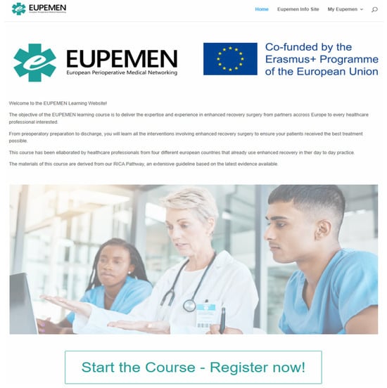 - Pesce, A.M.P.F.; Ramírez, J.M.; Fabbri, N.; Ubieto, J.M.; Bellosta, A.P.; Arroyo, A.; Sánchez-Guillén, L.; Whitley, A.; Kocián, P.; Rosetzka, K.; et al. The EUropean PErioperative MEdical Networking (EUPEMEN) project and recommendations for perioperative care in colorectal surgery: A quality improvement study. Int. J. Surg. 2024, 110, 4796–4803. [Google Scholar] [CrossRef] [PubMed]