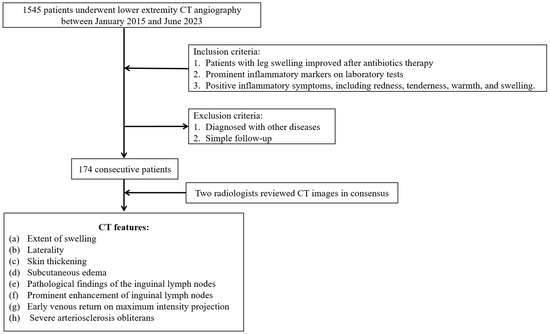 The Institutional Review Board of our hospital approved this study, and the requirement for informed consent was waived owing to the retrospective nature of the study. We retrospectively reviewed our institutional picture archiving and communication system. Using the search term “leg swelling”, 1545 patients who underwent lower extremity CT angiography between 1 January 2015 and 30 June 2023 were identified. Among these 1545 patients, we included those with cellulitis, defined as patients whose leg edema improved after antibiotic therapy and who exhibited prominent inflammatory markers on laboratory tests, such as elevated white blood cell (WBC) count, C-reactive protein (CRP) level, and erythrocyte sedimentation rate (ESR). Additionally, patients were required to present with inflammatory symptoms, including redness, pain, warmth, and swelling.