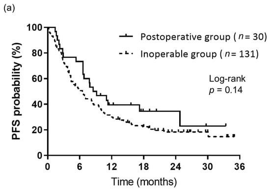 Kaplan–Meier curves of survival. (a) PFS of patients in the postoperative (n = 30) and inoperable (n = 131) groups. PFS did not significantly differ between the groups (median: 8.8 months for the postoperative group vs. 6.5 months for the inoperable group, p = 0.14). (b) OS of patients in the postoperative (n = 30) and inoperable (n = 131) groups. OS differed significantly between the groups (median: not reached for the postoperative group vs. 13.0 months for the inoperable group, p = 0.012).