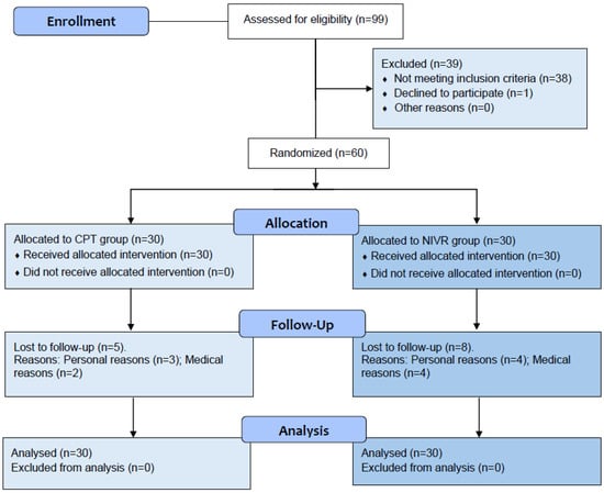 At the beginning of the study, the groups exhibited comparable sociodemographic characteristics (Table 1) and baseline levels of the study outcomes. Of the 99 individuals initially screened, 60 participants were enrolled, with 13 dropouts for reasons unrelated to the study protocol (Figure 1). Recruitment and follow-up occurred between April 2023 and March 2024. No adverse events, such as falls, fainting, nausea, or severe pain, were reported. Adherence rates were 73.3% in the CPT-G and 76.7% in the NIVR-G.