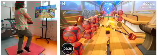 Figure 2. Experimental group subject performing NIVR intervention (A) and their avatar for feedback (B).