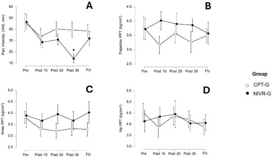 Changes in pain intensity (A) Visual Analog Scale [VAS], trapezius pressure pain threshold [PPT] (B), knee PPT (C), and hip PPT (D) after 10, 20, and 30 sessions, as well as at follow-up (FU), in the conventional physical therapy group (CPT-G) and the non-immersive virtual reality group (NIVR-G). The means and 95% confidence intervals are shown for each group at each time point. An asterisk (*) indicates a statistically significant difference between groups, in favor of the NIVR-G.
