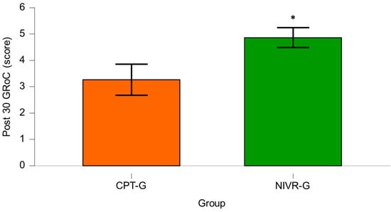 Comparison of Global Rating of Change for Pain (GRoC) after 30 sessions in the conventional physical therapy group (CPT-G) and the non-immersive virtual reality group (NIVR-G). An asterisk (*) indicates a statistically significant difference in favor of the NIVR-G.