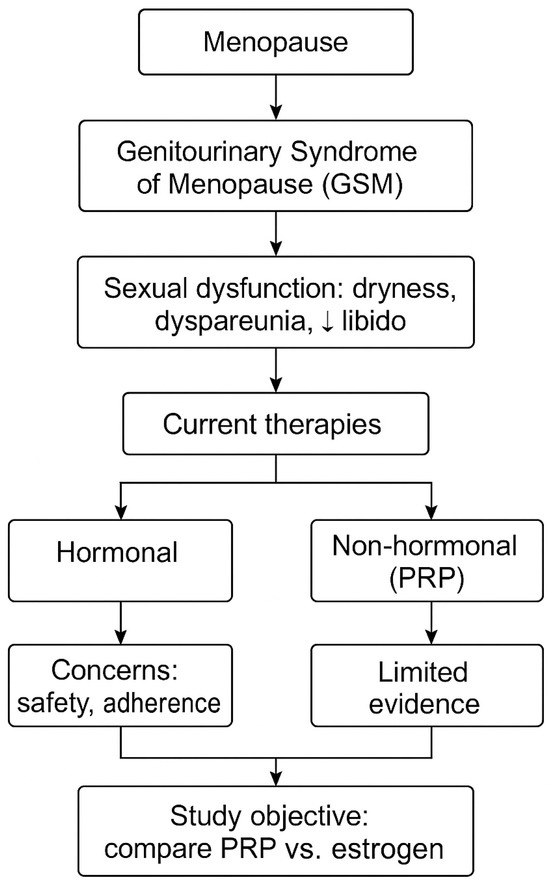 A visual representation of the rationale behind the study design is presented in Figure 1, highlighting the cascade from menopause to GSM, its impact on sexual function, the limitations of current therapeutic options (hormonal and non-hormonal), and the rationale for comparing intravaginal PRP with local estrogen therapy.