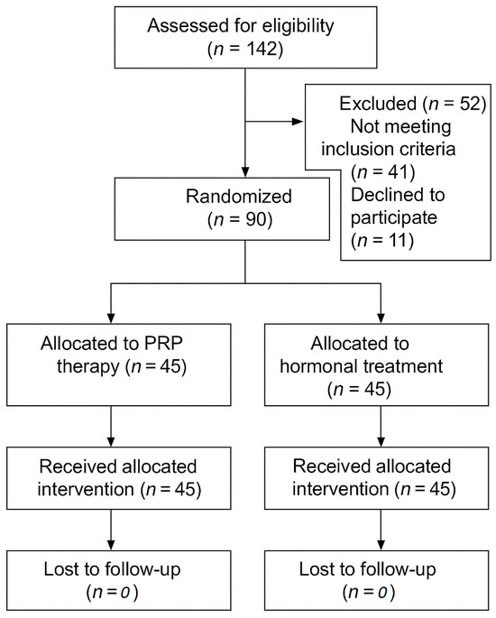 The participant flow through the study is illustrated in Figure 2, detailing the number of individuals assessed for eligibility, reasons for exclusion, randomization, allocation to treatment groups, and completion of follow-up. A total of 90 postmenopausal women were enrolled and randomized equally into the two treatment arms. All the participants completed the study protocol without dropping out. The trial was completed as originally planned; no interim analyses or early stopping criteria were applied.
