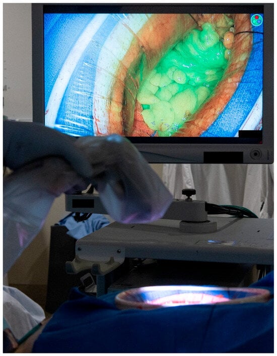 Each patient’s clinicopathological and operative characteristics are described in the Section 3, along with a technical description of each flap type and its associated outcomes. Continuous variables are expressed as medians with interquartile range (IQR). Adequate blood supply to each of the flaps was confirmed using either Doppler ultrasonography or the use of indocyanine green. The protocol in our institution is to administer 3 mL of indocyanine green followed by an immediate 5 mL flush of normal saline. The tissue of interest is then immediately assessed for adequate perfusion using Stryker’s SPY-PHI portable handheld imaging system (See Figure 1).