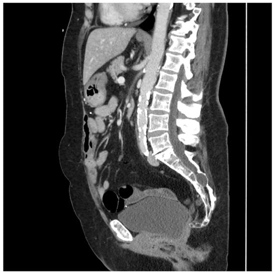 Sagittal CT scan performed four years after proctocolectomy and sigmoid mesocolic flap. The mesocolic flap is seen here filling the pelvis and adherent to the back of the bladder, forming a sling-like configuration, thus preventing the small bowel from adhering to the proctectomy resection bed in the pelvis. (Used with permission from the Mayo Foundation for Medical Education and Research; all rights reserved).