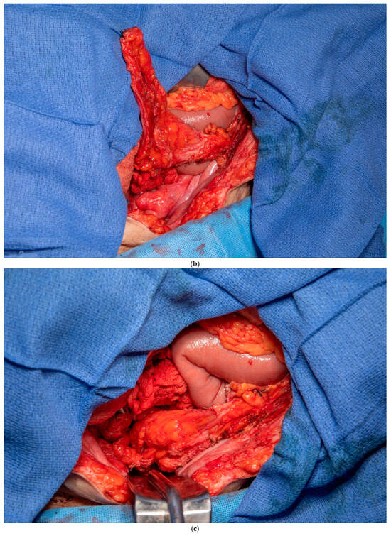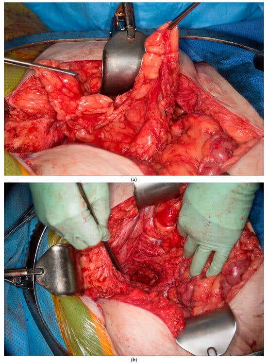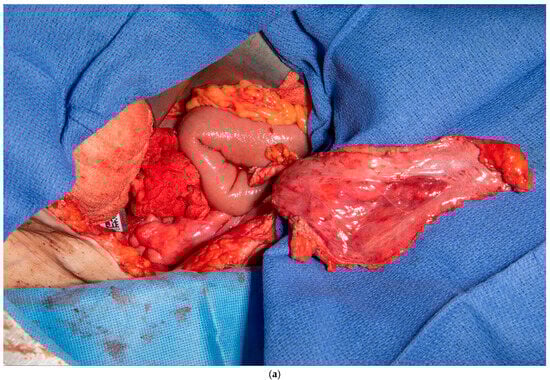 Furthermore, there are also circumstances when an immediate reconstruction using a myofasciocutaneous flap is not desirable, such as when the patient has limited reconstruction options, and there is a high risk of failure with reconstruction at the time of proctectomy. In these circumstances, a local pedicled flap using native intra-abdominal tissue to occlude the pelvis can be considered. Of the six patients reported on in this study, there were no prolonged perineal wound healing issues, and only one patient was re-admitted with a pelvic abscess that required drainage. Based on our median follow-up time of 26 months, we have not identified a single perineal hernia or an episode of small bowel obstruction after discharge from the hospital in this cohort. These results are broadly similar to the outcomes experienced in our OPF cohort, although we do acknowledge that the conclusions that can be drawn from a comparison of only six patients are limited. In our opinion, it seems biologically plausible that excluding the small bowel from the pelvis using a local pedicled flap or some other biological material would result in a reduced risk of perineal hernia formation, or small bowel obstruction secondary to a loop of intestine becoming adherent to a raw surface in the pelvis. These local pedicled flaps also have the advantage of not resulting in a second wound or potential loss of function, contrasting with some of the commonly used myofasciocutaneous flaps []. Theoretical risks include potential injury to a nearby anatomical structure, such as the bladder in the case of the perivesical fat flap or the kidney in the case of the Gerota’s fat pad flap, flap necrosis, bleeding, and a post-operative collection or abscess that requires radiological guided drainage.