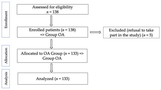 This cross-sectional study was conducted between 1 October and 30 December 2024, in the Medical Rehabilitation Department of Avram Iancu Clinical Hospital in Oradea, Romania. The primary aim was to assess the QoL in patients diagnosed with HOA and KOA. Diagnosis was established by a certified specialist in physical and rehabilitation medicine, based on clinical examination and standard radiographic imaging, in accordance with the diagnostic criteria of the American College of Rheumatology (ACR). A total of 138 patients were initially evaluated, out of which 133 met the inclusion criteria and agreed to participate in the study.